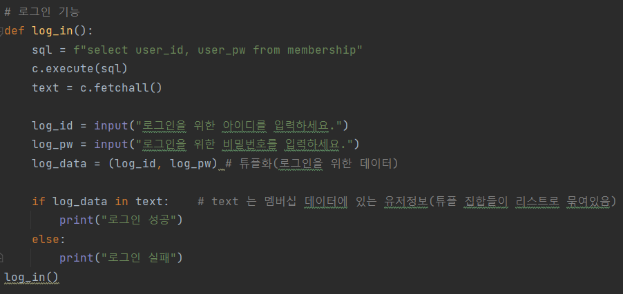 3) 로그인을 위한 id 와 pw 를 입력하게 하고, 이를 튜플화 하여 묶은 후 log_data 에 담는다.